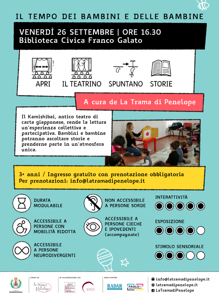Il Kamishibai, antico teatro di carta giapponese, trasforma la lettura in un’esperienza collettiva e partecipativa, dove il coinvolgimento di chi ascolta diventa centrale nella lettura delle storie. I bambini e le bambine potranno ascoltare tanti diversi racconti ed essere coinvolti nella lettura in un’atmosfera speciale che questo libro-teatro riesce a creare.