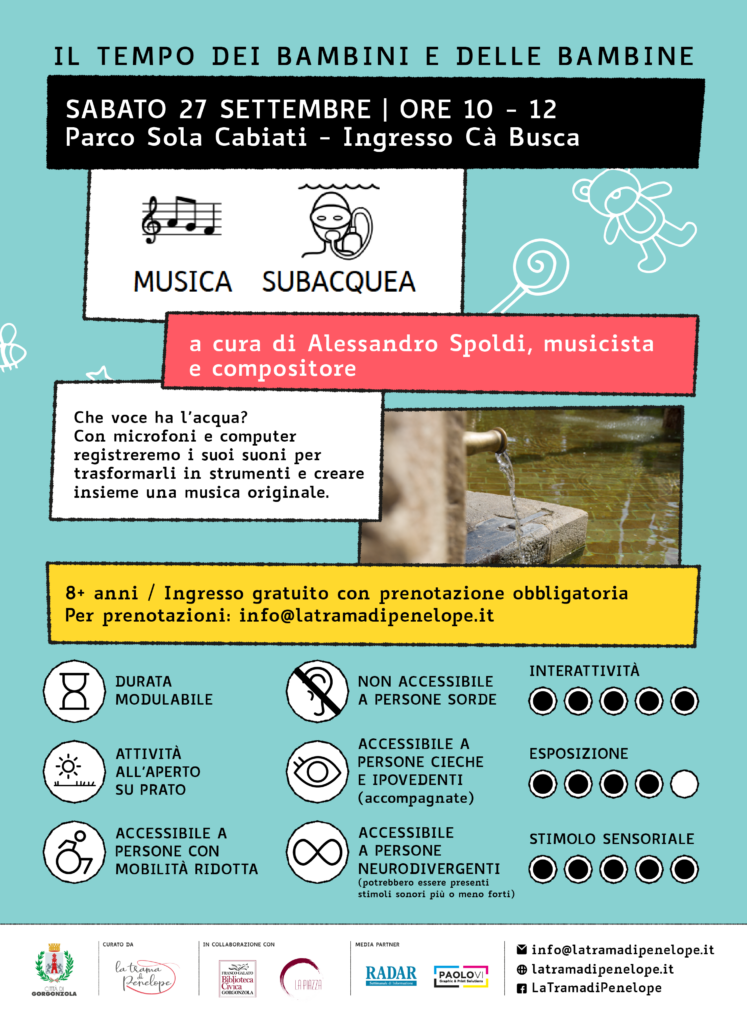 Che voce ha l’acqua? Cosa sentiremmo se fossimo dei sassi che cadono nell’acqua? Proviamo a scoprirlo insieme durante il laboratorio. Grazie a speciali microfoni e a un computer registreremo diversi suoni che diventeranno strumenti musicali per realizzare una vera e propria musica originale.